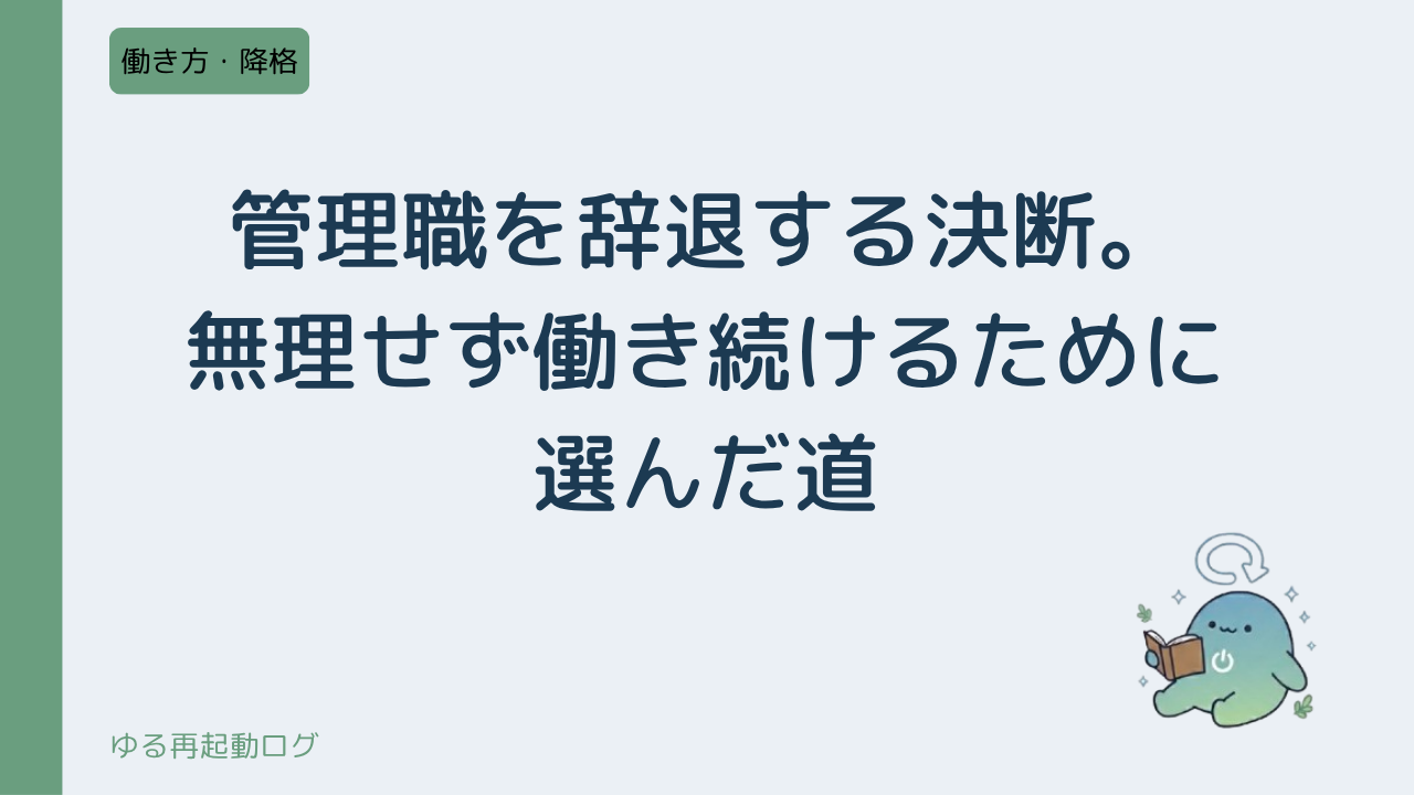 当サイトの人気記事Popular Post 管理職を続けるか辞めるか。復職後に直面した大きな迷い 20 views 管理職を辞退する決断。無理せず働き続けるために選んだ道 7 views 復職して3ヶ月。ようやく見えてきた自分のペース 4 views 復職して1ヶ月。慣れてきた頃にぶつかった壁 2 views 復職初日。薬を飲んで、それでも一歩を踏み出した日 2 views 復職を決めた日。怖さもあったけど、進んでみようと思えた理由 2 views 復職前、上司に電話した日。正直イヤだったけど、それでも連絡した 1 views 休職中にやってよかったこと5選|焦らず過ごすためのヒント 1 views 新着記事New Post 管理職を辞退する決断。無理せず働き続けるために選んだ道 2026.03.28 働き方・降格 管理職を続けるか辞めるか。復職後に直面した大きな迷い 2025.10.04 休職・復職 復職して3ヶ月。ようやく見えてきた自分のペース 2025.10.02 休職・復職 休職・復職 働き方・降格 ゆるお会社員Profileゆるおと申します。 「ゆっくり、自分らしく、ぼちぼち生きていこう」そんな思いを込めた名前です。 40代・高卒・製造業の会社員。 適応障害で休職し、復職・降格を経て、今を生きています。 妻と子どもに支えられながら、焦らず、無理せず、一日一日を積み重ねています。 このブログが「自分だけじゃないんだ」と感じてもらえる場所になれば嬉しいです。